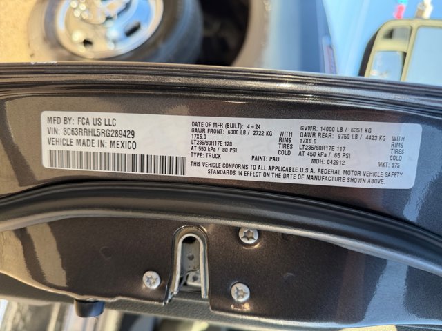2024 Ram 3500 Big Horn Quick Order Package 2HZ Big Horn,3.73 Axle Ratio,Wheels: 18 x 8.0 Steel Chrome Clad,Wheels: 18 x 8.0 Polished Aluminum,Wheels: 17 x 6.0 Steel Chrome Clad,Cloth 40/20/40 Bench Seat,Premium Cloth 40/20/40 Bench Seat,Level 1 Equipment Group,5th Wheel/Gooseneck Towing Prep Group,Clearance Lamps,Dual Rear Wheels,Engine Block Heater,Chrome Flat Cab-Length Side Steps,Front Fog Lamps,Front License Plate Bracket,Manufacturer's Statement of Origin,Power Heated Fold Telescopic Mirrors,Rear Wheelhouse Liners,Radio: Uconnect 3 w/5 Display,Radio: Uconnect 5 w/8.4 Display (DISC),MOPAR Spray In Bedliner,2nd Row In Floor Storage Bins,40/20/40 Split Bench Seat,4 Way Front Headrests,Front Armrest w/Cupholders,Rear Folding Seat,Rear 60/40 Folding Seat,2 Way Rear Headrest Seat,Front Seat Back Map Pockets,Storage Tray,Front Center Seat Cushion Storage,Foam Bottle Insert (Door Trim Panel),6000# Front Axle w/Hub Ext,Locking Lower Glove Box,Dual Glove Boxes,GPS Antenna Input,Active Noise Control System,Manual Adjust 4-Way Driver Seat,Power Adjust 8-Way Driver Seat,Manual Adjust 4-Way Front Passenger Seat,Selectable Tire Fill Alert,Footwell Courtesy Lamp,Glove Box Lamp,Black Exterior Mirrors,Exterior Mirrors w/Supplemental Signals,Exterior Mirrors Courtesy Lamps,Power Adjust Mirrors,Power Telescoping Mirrors,Auto Power-Folding Mirrors,Power-Adjustable Convex Aux Mirrors,Forward & Reverse Utility Lights,Rear Dome w/On/Off Switch Lamp,Box & Rear Fender Clearance Lamps,Mirror Running Lights,Exterior Mirrors w/Heating Element,Electronically Controlled Throttle,All R1 Low Radios,All Radio Equipped Vehicles,Global Telematics Box Module (TBM),Steering Wheel Mounted Audio Controls,Google Android Auto,8.4 Touchscreen Display,Apple CarPlay,Remote USB Port - Charge Only,SiriusXM Satellite Radio,Bluetooth Handsfree Phone & Audio,Integrated Center Stack Radio,Connectivity - US/Canada,4G LTE Wi-Fi Hot Spot,Leather Wrapped Steering Wheel,Center Hub,SiriusXM Radio Service,For Details Visit DriveUconnect.com,For More Info, Call 800-643-2112,Tip Start,Integrated Voice Command w/Bluetooth,4-Wheel Disc Brakes,Emergency communication system: SiriusXM Guardian,Front Center Armrest w/Storage,Compass,Variably intermittent wipers,Turn signal indicator mirrors,Trip computer,Traction control,Tilt steering wheel,Speed control,Remote keyless entry,Rear step bumper,Rear seat center armrest,Radio data system,Power windows,Power steering,Power door mirrors,Passenger vanity mirror,Passenger door bin,Panic alarm,Overhead console,Overhead airbag,Outside temperature display,Occupant sensing airbag,Low tire pressure warning,Illuminated entry,Heated door mirrors,Fully automatic headlights,Front reading lights,Front anti-roll bar,Dual front side impact airbags,Dual front impact airbags,Driver door bin,Delay-off headlights,Bumpers: chrome,Brake assist,Adjustable head restraints: driver and passenger w/tilt,ABS brakes,Voltmeter,Tachometer,ParkView Rear Back-Up Camera,Electronic Stability Control,Air Conditioning,6 Speakers, MOPAR SPRAY IN BEDLINER, DIESEL GRAY/BLACK PREMIUM CLOTH 40/20/40 BENCH SEAT -inc: Rear 60/40 Folding Seat Front Center Seat Cushion Storage Power Adjust 8-Way Driver Seat Front Seat Back Map Pockets Power 2-Way Driver Lumbar Adjust, FRONT FOG LAMPS, REAR WHEELHOUSE LINERS, 3.73 AXLE RATIO (STD), RADIO: UCONNECT 5 W/8.4 DISPLAY -inc: Google Android Auto SiriusXM Radio Service Selectable Tire Fill Alert SiriusXM Satellite Radio Integrated Center Stack Radio For More Info Call 800-643-2112 Connectivity - US/Canada 4G LTE Wi-Fi Hot Spot All Radio Equipped Vehicles All R1 Low Radios 8.4 Touchscreen Display Apple CarPlay, MANUFACTURER'S STATEMENT OF ORIGIN, GVWR: 14 000 LBS, LEVEL 1 EQUIPMENT GROUP -inc: Leather Wrapped Steering Wheel Rear Dome w/On/Off Switch Lamp Front Fog Lamps Glove Box Lamp Auto Power-Folding Mirrors Footwell Courtesy Lamp Mirror Running Lights Radio: Uconnect 5 w/8.4 Display Foam Bottle Insert (Door Trim Panel) Wheels: 18 x 8.0 Polished Aluminum Big Horn IP Badge Forward & Reverse Utility Lights Locking Lower Glove Box Power Heated Fold Telescopic Mirrors Steering Wheel Mounted Audio Controls Dual Glove Boxes 2nd Row In Floor Storage Bins Power Telescoping Mirrors, RADIO: UCONNECT 5 W/8.4 DISPLAY -inc: Google Android Auto SiriusXM Radio Service Selectable Tire Fill Alert SiriusXM Satellite Radio Integrated Center Stack Radio For More Info Call 800-643-2112 Connectivity - US/Canada 4G LTE Wi-Fi Hot Spot All Radio Equipped Vehicles All R1 Low Radios 8.4 Touchscreen Display Apple CarPlay, POWER 2-WAY DRIVER LUMBAR ADJUST, WHEELS: 17 X 6.0 STEEL CHROME CLAD, CLEARANCE LAMPS, QUICK ORDER PACKAGE 2HZ BIG HORN -inc: Engine: 6.7L I6 Cummins Turbo Diesel Transmission: 6-Speed Automatic 68RFE, TRANSMISSION: 6-SPEED AUTOMATIC 68RFE -inc: Urethane Shift Control, ENGINE: 6.7L I6 CUMMINS TURBO DIESEL -inc: Selective Catalytic Reduction (Urea) Dual 730 Amp Maintenance Free Batteries Cummins Turbo Diesel Badge Heavy Duty Engine Cooling Current Generation Engine Controller Diesel Exhaust Brake Supplemental Heater Capless Fuel Fill w/o Discriminator GVWR: 12 300 lbs, 5TH WHEEL/GOOSENECK TOWING PREP GROUP, DUAL REAR WHEELS -inc: Clearance Lamps Tires: LT235/80R17E BSW AS 17 Steel Spare Wheel Box & Rear Fender Clearance Lamps 6000# Front Axle w/Hub Ext GVWR: 14 000 lbs Rear Wheelhouse Liners, CHROME FLAT CAB-LENGTH SIDE STEPS, TIRES: LT235/80R17E OWL ON/OFF ROAD, FRONT LICENSE PLATE BRACKET, ENGINE BLOCK HEATER, GRANITE CRYSTAL METALLIC CLEARCOAT, Four Wheel Drive, Tow Hitch, Power Steering, ABS, 4-Wheel Disc Brakes, Brake Assist, Locking/Limited Slip Differential, Conventional Spare Tire, Tow Hooks, Integrated Turn Signal Mirrors, Power Mirror(s), Heated Mirrors, Intermittent Wipers, Variable Speed Intermittent Wipers, Privacy Glass, Power Door Locks, Daytime Running Lights, Automatic Headlights, AM/FM Stereo, Bluetooth Connection, MP3 Capability, Auxiliary Audio Input, Adjustable Steering Wheel, Trip Computer, 