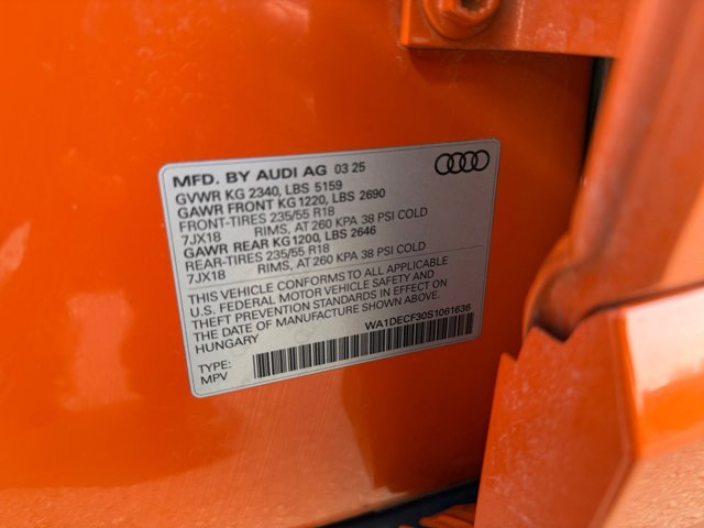 2025 Audi Q3 S line Premium Radio: Audi Sound System,Heated Front Bucket Seats,Leather Seating Surfaces,Wheels: 18 5-V-Spoke-S Design,4-Wheel Disc Brakes,Audi smartphone interface (Apple CarPlay/Android Auto),Power moonroof: Panoramic,Emergency communication system: Audi connect CARE,Auto High-beam Headlights,Exterior Parking Camera Rear,10 Speakers,Variably intermittent wipers,Turn signal indicator mirrors,Trip computer,Traction control,Tilt steering wheel,Telescoping steering wheel,Steering wheel mounted audio controls,Split folding rear seat,Speed-sensing steering,Speed control,Remote keyless entry,Rear window wiper,Rear window defroster,Rear seat center armrest,Rear reading lights,Rear anti-roll bar,Rear air conditioning,Rain sensing wipers,Radio data system,Power windows,Power steering,Power passenger seat,Power driver seat,Power door mirrors,Passenger vanity mirror,Passenger door bin,Panic alarm,Overhead console,Overhead airbag,Outside temperature display,Occupant sensing airbag,Low tire pressure warning,Leather steering wheel,Knee airbag,Illuminated entry,Heated front seats,Heated door mirrors,Fully automatic headlights,Front reading lights,Front fog lights,Front dual zone A/C,Front anti-roll bar,Four wheel independent suspension,Dual front side impact airbags,Dual front impact airbags,Driver vanity mirror,Driver door bin,Delay-off headlights,Bumpers: body-color,Brake assist,Automatic temperature control,Alloy wheels,Adjustable head restraints: driver and passenger w/tilt,AM/FM radio,ABS brakes,Tachometer,Spoiler,Power Liftgate,Leather Shift Knob,Front Center Armrest,Front Bucket Seats,Electronic Stability Control,Air Conditioning, Turbocharged, All Wheel Drive, Power Steering, ABS, 4-Wheel Disc Brakes, Brake Assist, Brake Actuated Limited Slip Differential, Aluminum Wheels, Tires - Front Performance, Tires - Rear Performance, Temporary Spare Tire, Sun/Moonroof, Generic Sun/Moonroof, Panoramic Roof, Heated Mirrors, Power Mirror(s), Integrated Turn Signal Mirrors, Rear Defrost, Privacy Glass, Intermittent Wipers, Variable Speed Intermittent Wipers, Rain Sensing Wipers, Rear Spoiler, Remote Trunk Release, Power Liftgate, Power Door Locks, Daytime Running Lights, Automatic Headlights, Headlights-Auto-Leveling, LED Headlights, Fog Lamps, Automatic Highbeams, AM/FM Stereo, Bluetooth Connection, Telematics, Smart Device Integration, Requires Subscription, MP3 Capability, Steering Wheel Audio Controls, Auxiliary Audio Input, Bluetooth Connection, Power Driver Seat, Power Passenger Seat, Bucket Seats, Heated Front Seat(s), Driver Adjustable Lumbar, Passenger Adjustable Lumbar, Pass-Through Rear Seat, Rear Bench Seat, Adjustable Steering Wheel, Trip Computer, Power Windows, Leather Steering Wheel, Keyless Entry, Power Door Locks, Cruise Control, Adaptive Cruise Control, Climate Control, Multi-Zone A/C, A/C, A/C, Rear A/C, Leather Seats, Driver Vanity Mirror, Passenger Vanity Mirror, Driver Illuminated Vanity Mirror, Passenger Illuminated Visor Mirror, Floor Mats, Cargo Shade, Smart Device Integration, Power Windows, Power Door Locks, Trip Computer, Immobilizer, Cruise Control Steering Assist, Traction Control, Stability Control, Traction Control, Front Side Air Bag, Telematics, Requires Subscription, Rear Parking Aid, Blind Spot Monitor, Cross-Traffic Alert, Rear Collision Mitigation, Lane Departure Warning, Lane Keeping Assist, Lane Departure Warning, Front Collision Mitigation, Tire Pressure Monitor, Driver Air Bag, Passenger Air Bag, Front Head Air Bag, Rear Head Air Bag, Passenger Air Bag Sensor, Knee Air Bag, Child Safety Locks, Back-Up Camera